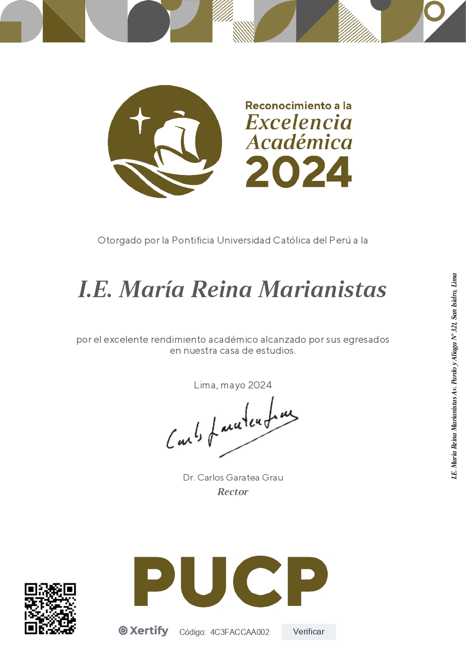 La Pontificia Universidad Católica del Perú hizo entrega del reconocimiento a la Excelencia Académica 2024 por el buen rendimiento académico alcanzado por los egresados de María Reina en esa casa de estudios. Sin duda, este logro es fruto del esfuerzo conjunto de toda la comunidad educativa. Sigamos trabajando juntos por una educación integral de calidad. ¡Felicitaciones por el logro alcanzado!