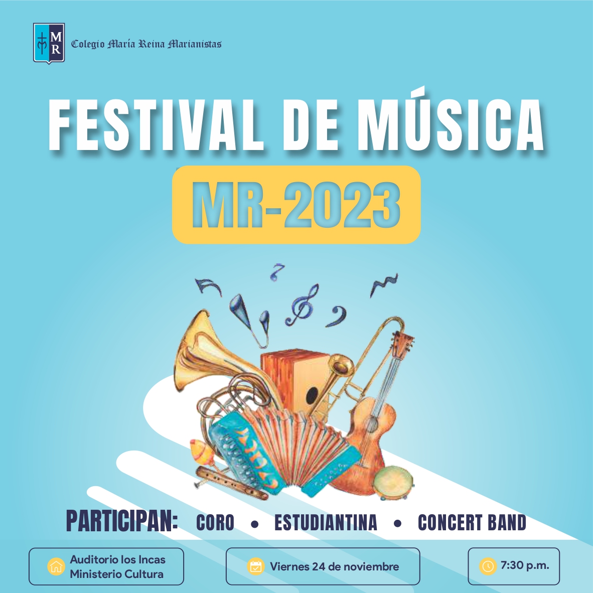 Estarán presentes nuestros elencos de: Coro, Estudiantina y Concert Band Viernes 24 de noviembre Hora: 7:30 p.m. Lugar: Auditorio «Los Incas» – Ministerio de Cultura – Av. Javier Prado Este 2465 San Borja.