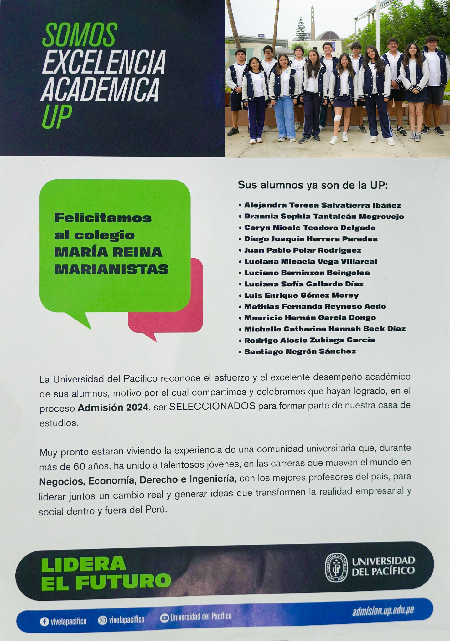 Nos sentimos orgullosos por haber recibido de la Universidad del Pacífico, el reconocimiento a la Excelencia Académica. Este logro ha sido obtenido gracias al brillante desempeño de nuestros estudiantes en el Proceso de Admisión 2024. Esto nos invita a seguir comprometidos en brindar una educación integral de calidad. Agradecemos a toda la Comunidad Educativa por el logro alcanzado.