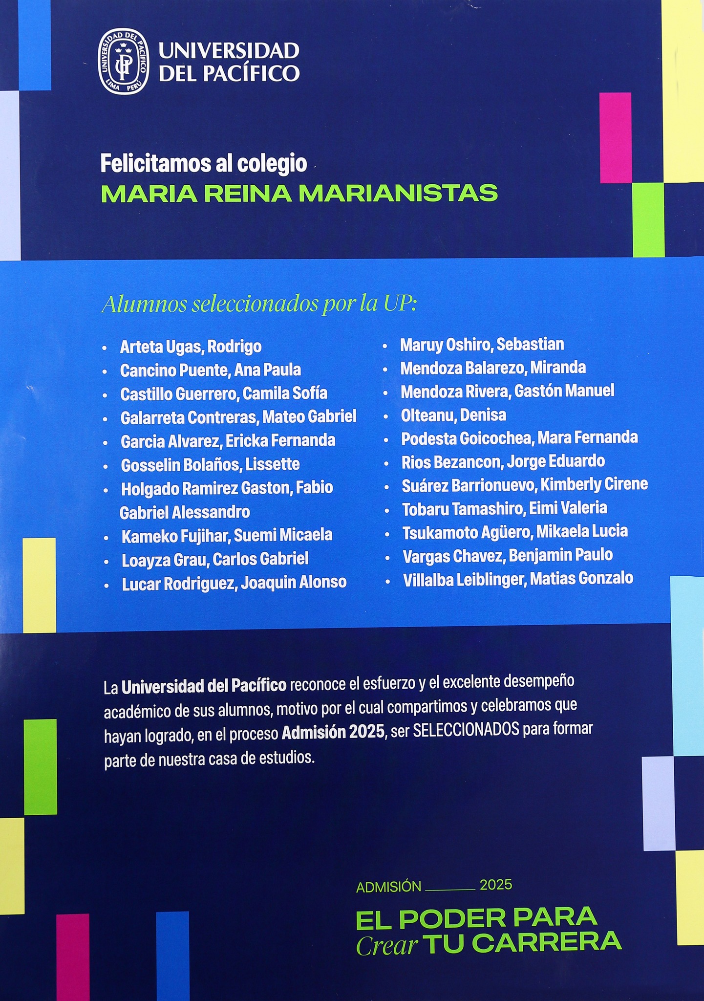 Felicitamos a los estudiantes de la promoción LI por su selección en el proceso de admisión 2025 de la Universidad del Pacífico. Su dedicación y excelencia académica les han abierto las puertas para formar parte de ella.