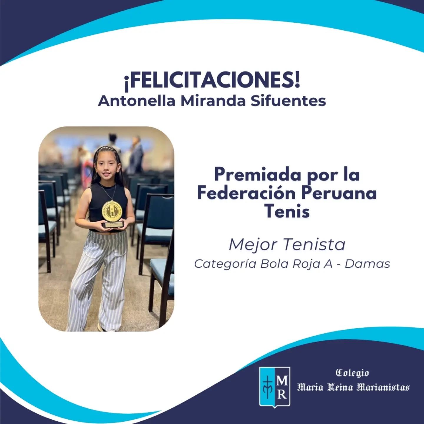 Felicitamos con gran alegría a nuestra estudiante Antonella Miranda Sifuentes, por haber sido reconocida por la Federación Peruana de Tenis como Mejor Tenista en la categoría Bola Roja A – Damas.